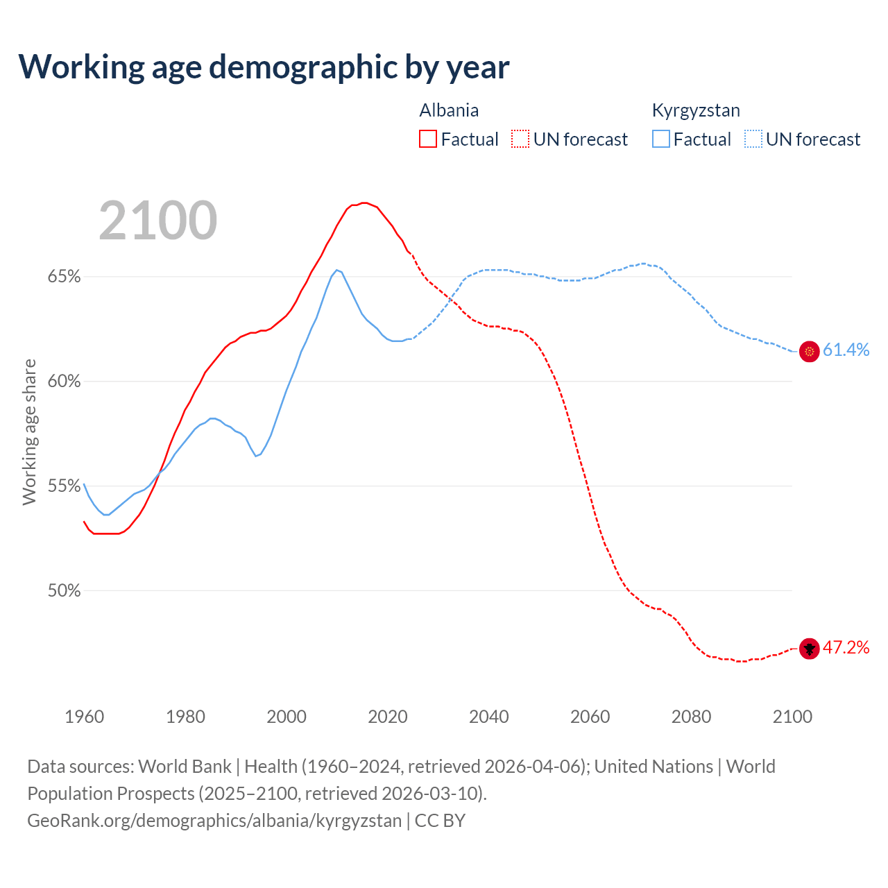 Median age Albania vs Kyrgyzstan, 1960-2100