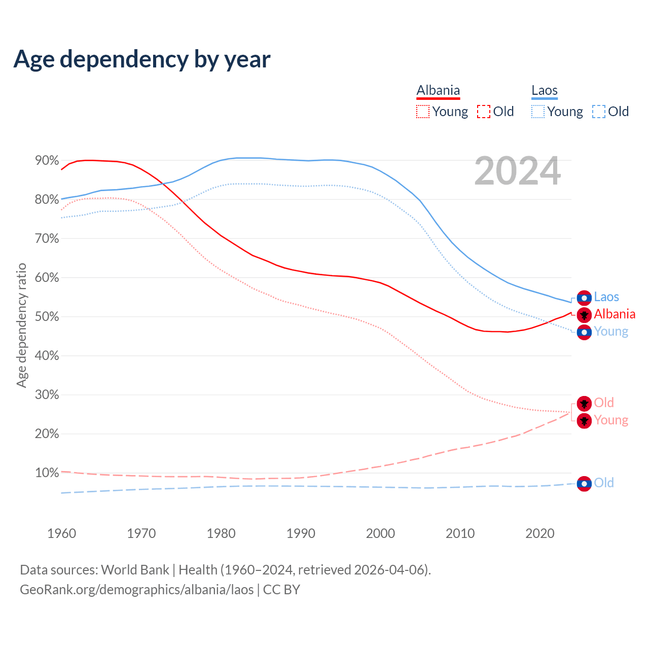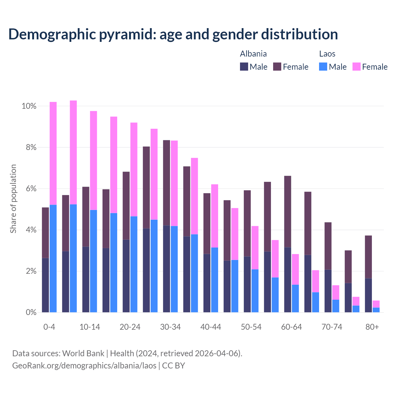- Albania is ranked 60/196 by median age (oldest to youngest) vs 130/196 for Laos.