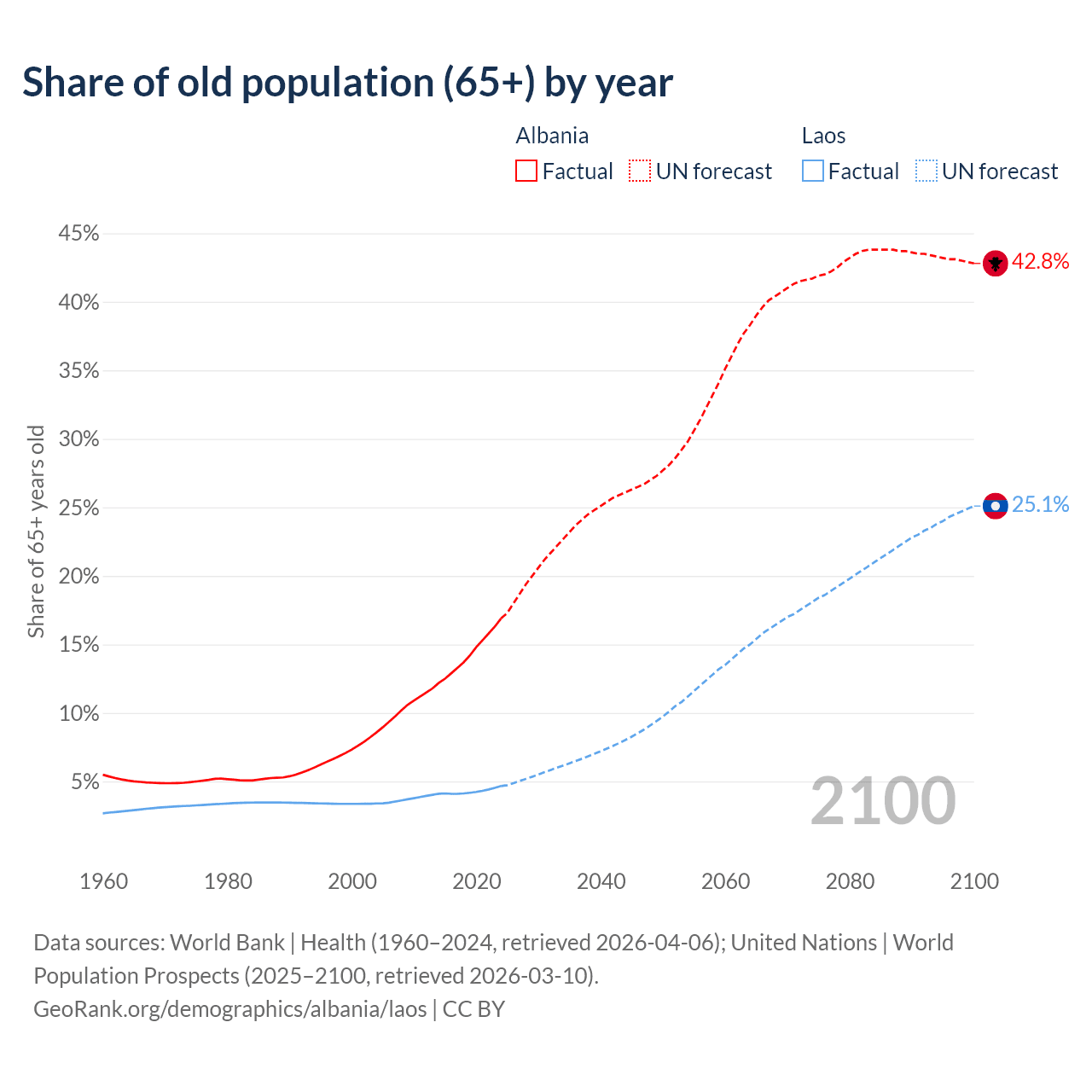 - The share of old-age demographic (65+) in Albania is 16.9% vs 4.67% in Laos.