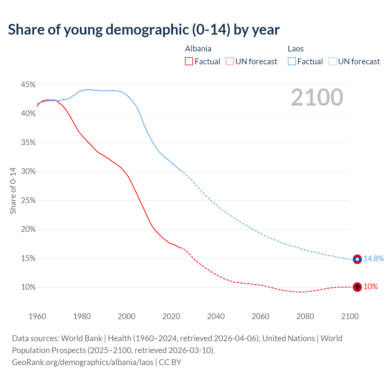 - The share of young demographic (0-15 years old) in Albania is 16.8% vs 30.2% in Laos.