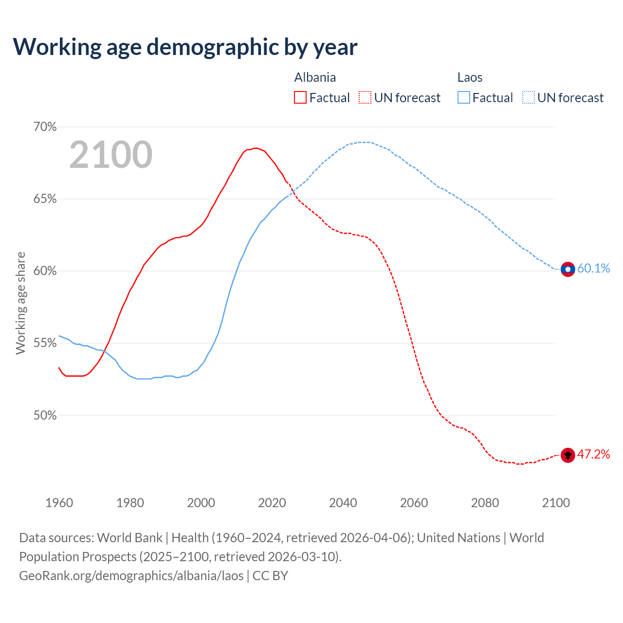 - Albania has 1.55M working age adults (aged 15-64) vs 5.21M in Laos.