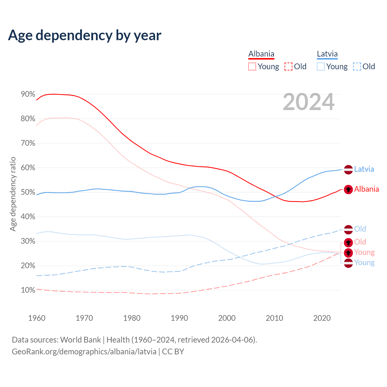 - Albania is ranked 60/196 by median age (oldest to youngest) vs 20/196 for Latvia.