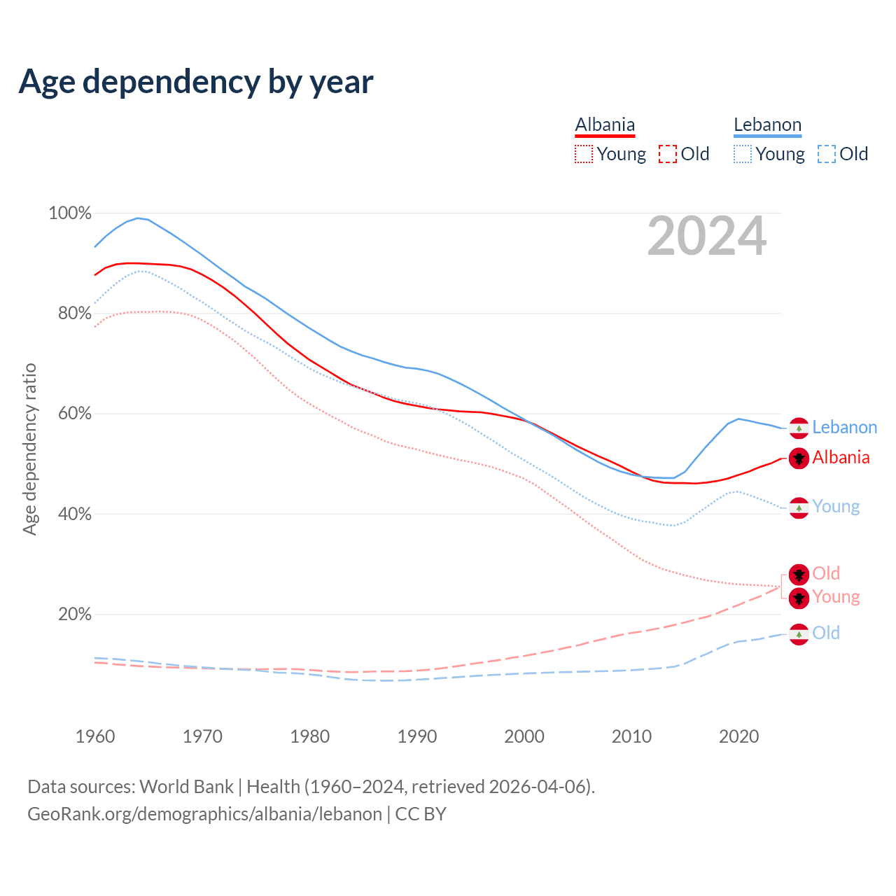 - Albania is ranked 60/196 by median age (oldest to youngest) vs 106/196 for Lebanon.