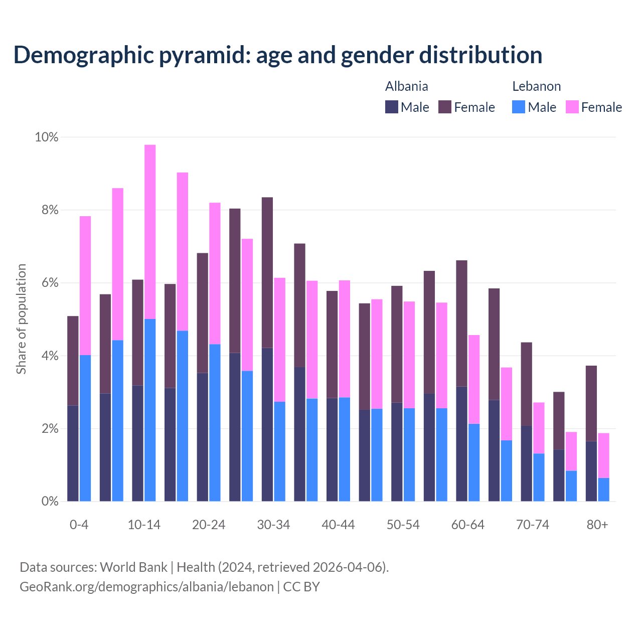 - As of 2026, the population of Albania is 2.34M vs 5.91M in Lebanon - 2.52 times difference.