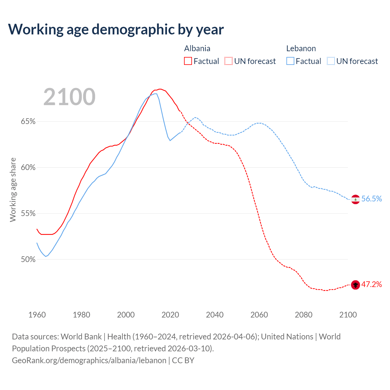 - Albania has 1.55M working age adults (aged 15-64) vs 3.76M in Lebanon.