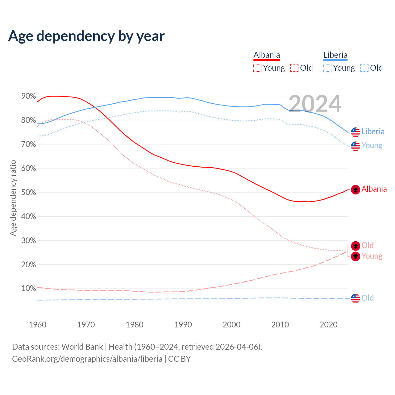 - The share of old-age demographic (65+) in Albania is 16.9% vs 3.3% in Liberia.