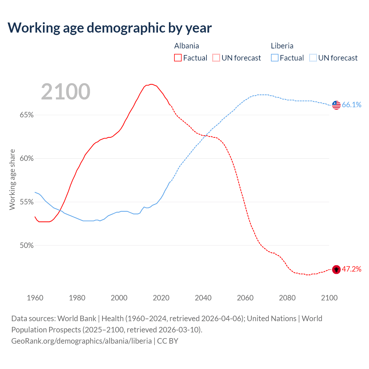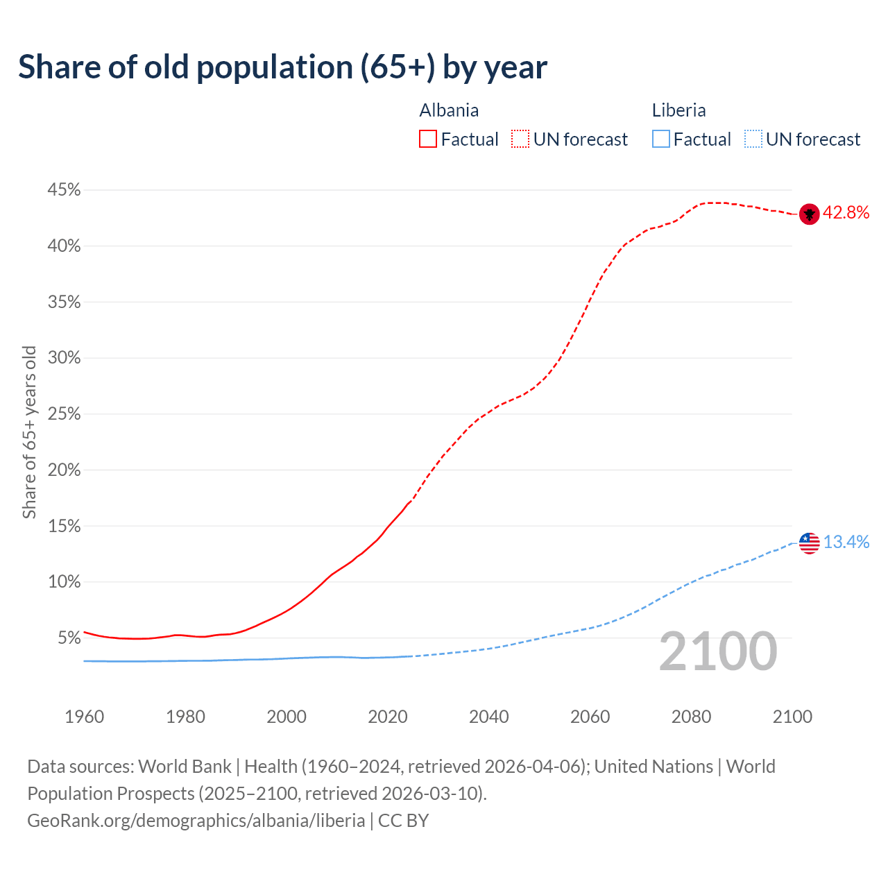 Median age Albania vs Liberia, 1960-2100