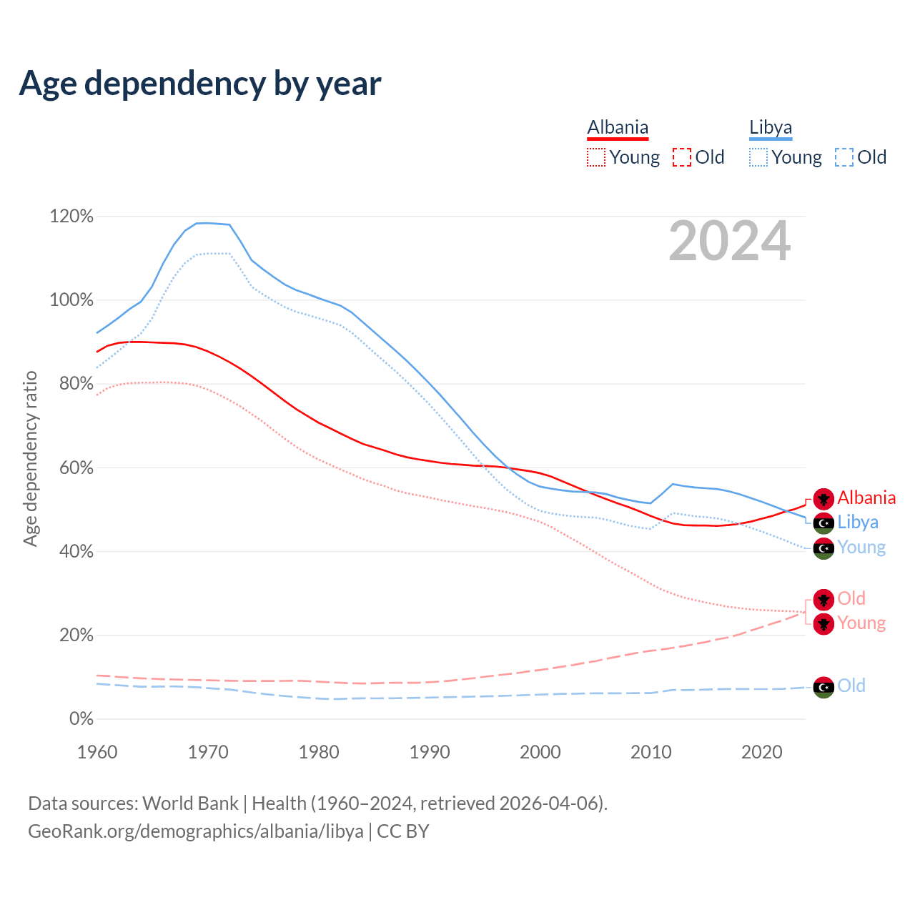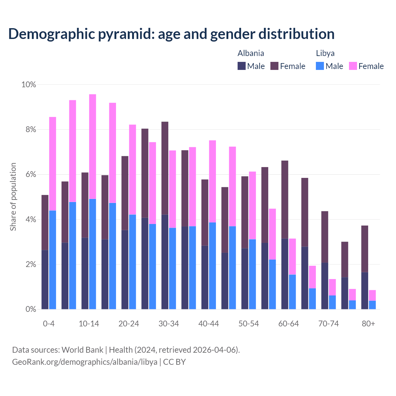 - Albania is ranked 60/196 by median age (oldest to youngest) vs 114/196 for Libya.