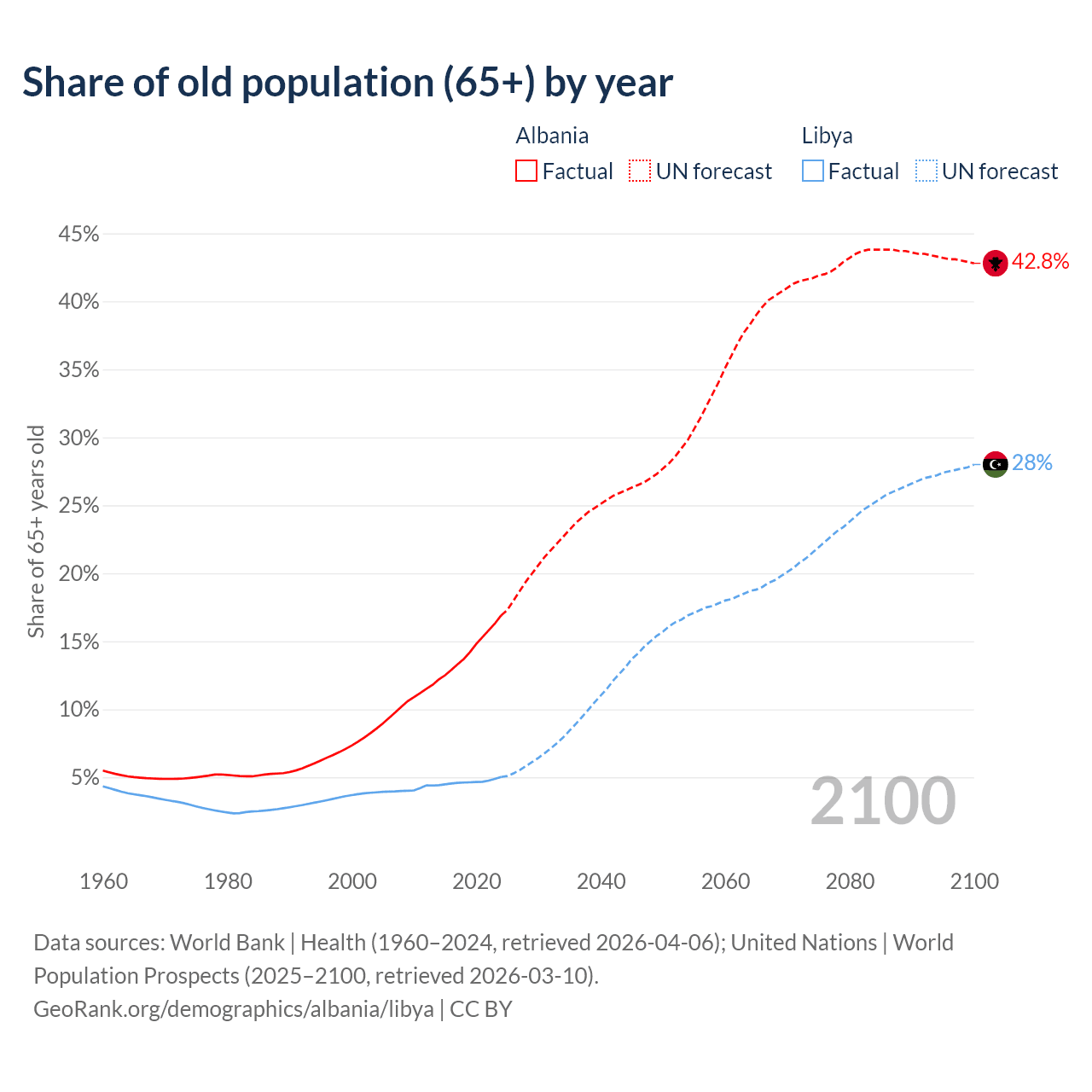 - The share of old-age demographic (65+) in Albania is 16.9% vs 5.02% in Libya.
