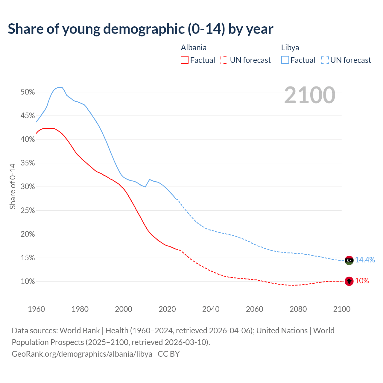 - The share of young demographic (0-15 years old) in Albania is 16.8% vs 27.4% in Libya.
