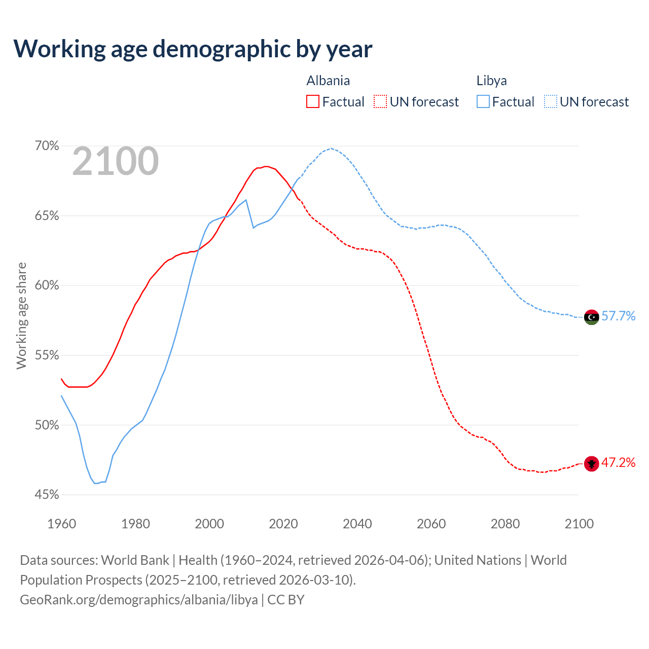 - Albania has 1.55M working age adults (aged 15-64) vs 5.11M in Libya.