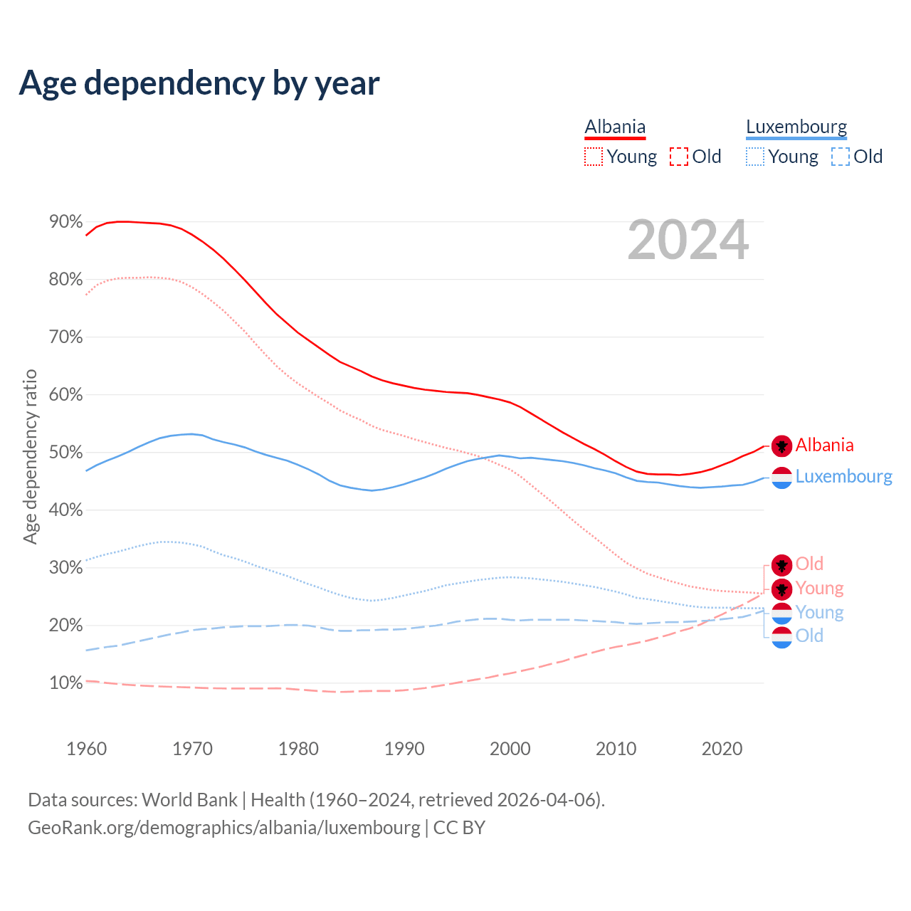 - Albania is ranked 60/196 by median age (oldest to youngest) vs 46/196 for Luxembourg.