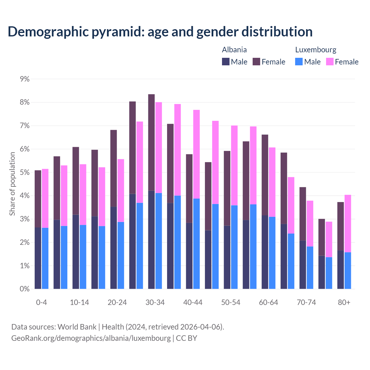 - The share of young demographic (0-15 years old) in Albania is 16.8% vs 15.8% in Luxembourg.