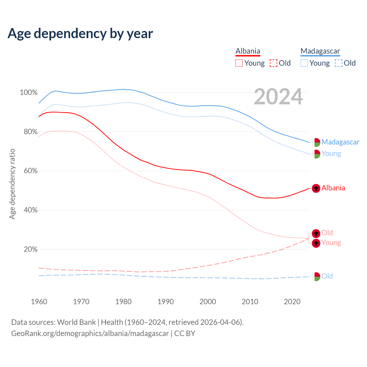 Data sources: World Bank | Health (1960–2024, retrieved 2026-04-06); U.S. Census Bureau (1960–2024, retrieved 2026-02-08).