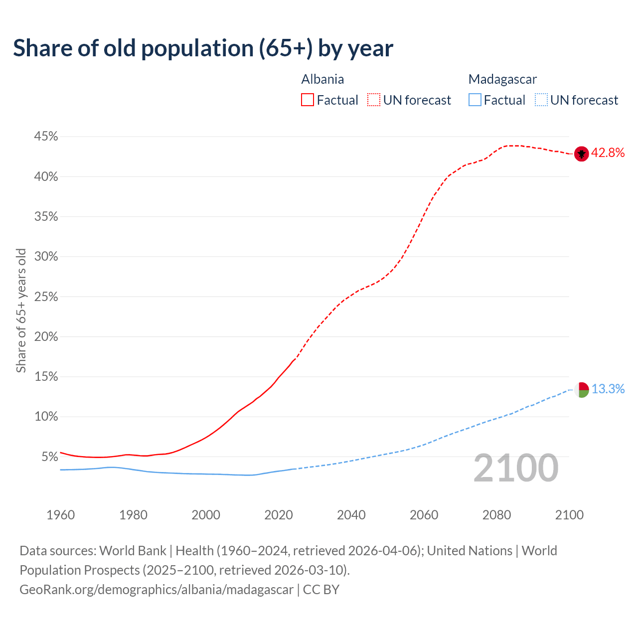 The share of older people aged 65 and over is 16.9% in Albania and 3.41% in Madagascar. Life expectancy in Albania compared to Madagascar .
