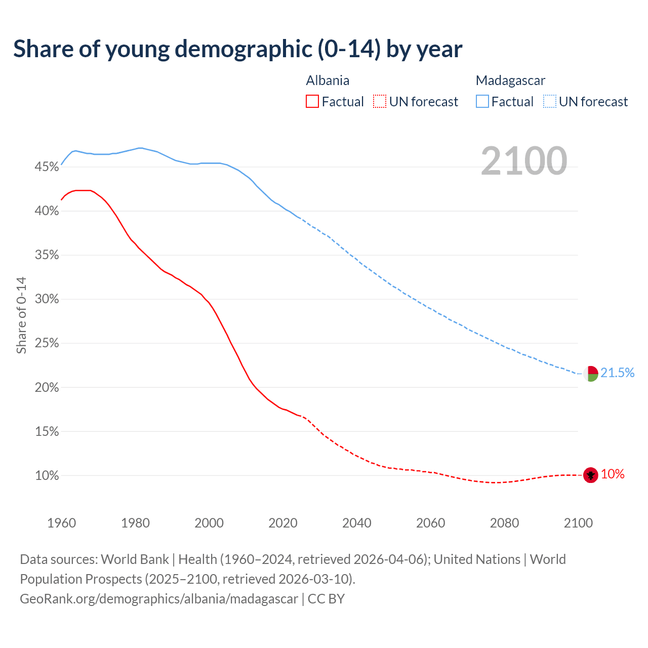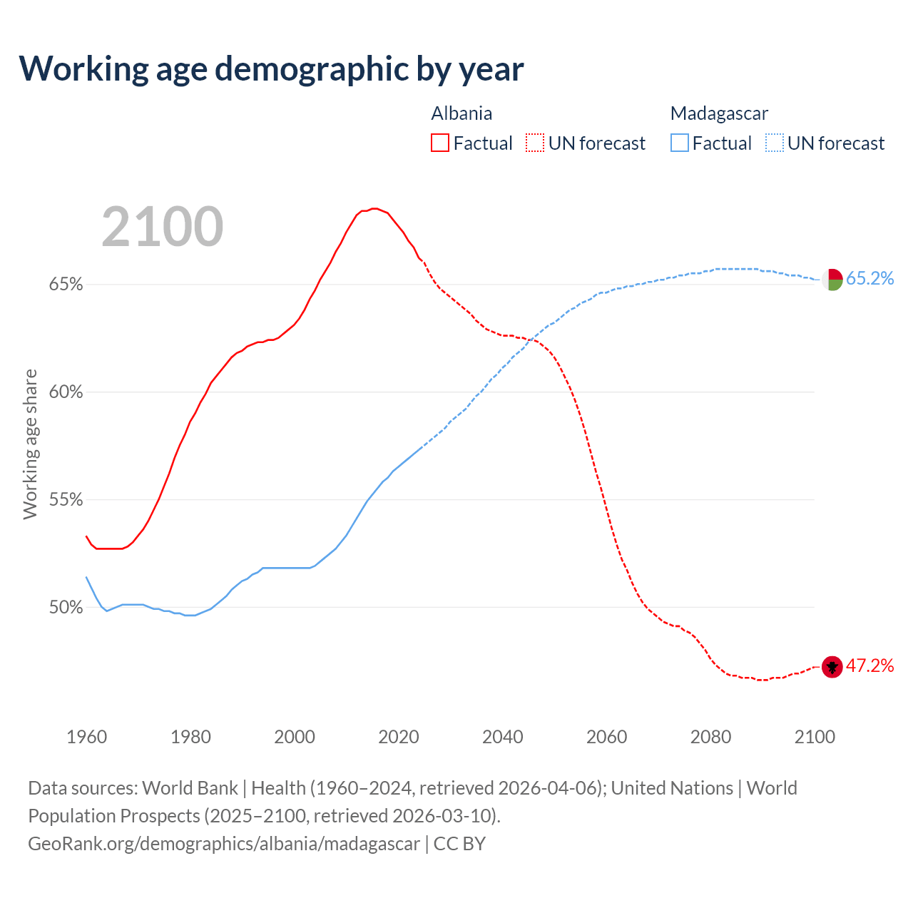 Median age Albania vs Madagascar, 1960-2100