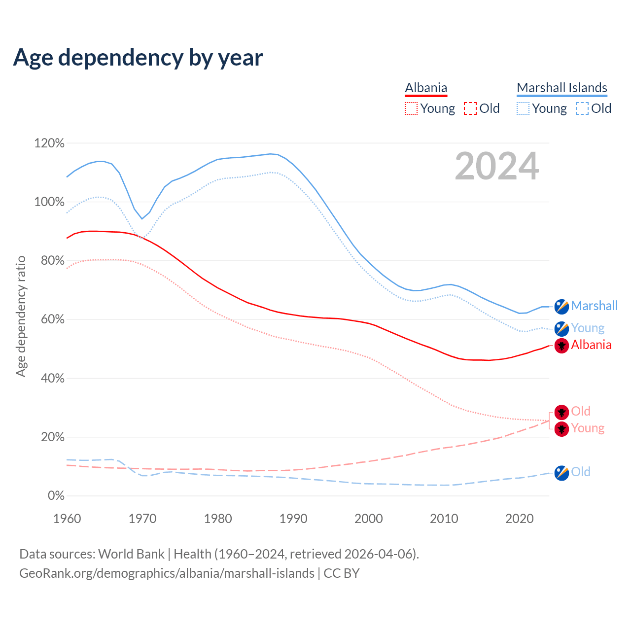 - The share of old-age demographic (65+) in Albania is 16.9% vs 4.64% in the Marshall Islands.