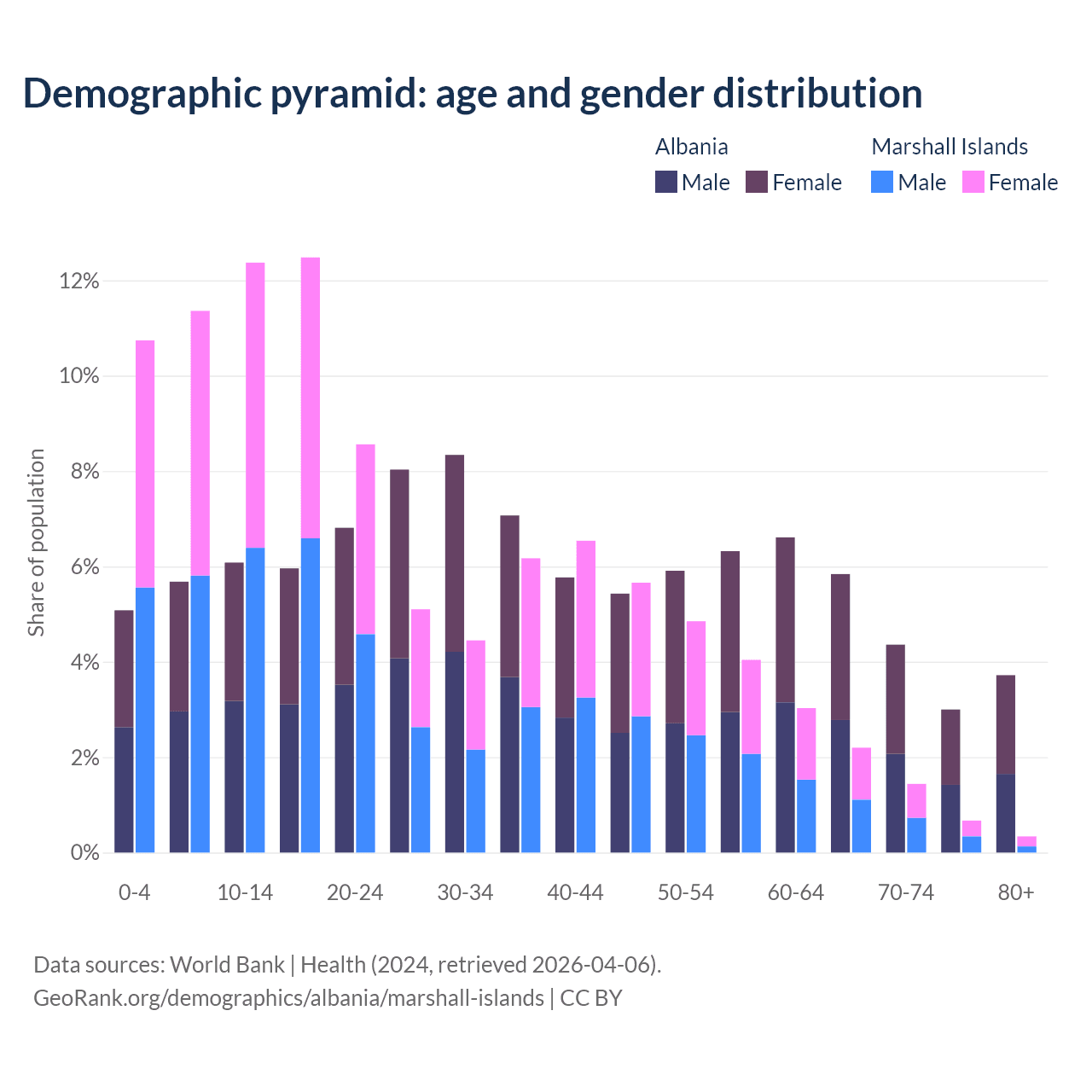 - As of 2026, the population of Albania is 2.34M vs 35.1K in the Marshall Islands - 66.8 times difference.