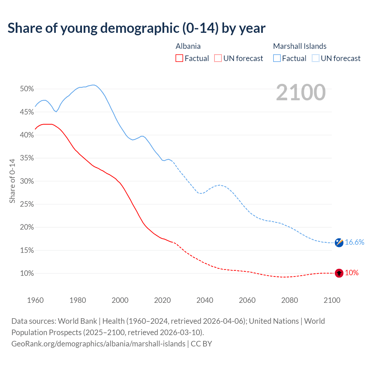 - The share of young demographic (0-15 years old) in Albania is 16.8% vs 34.5% in the Marshall Islands.