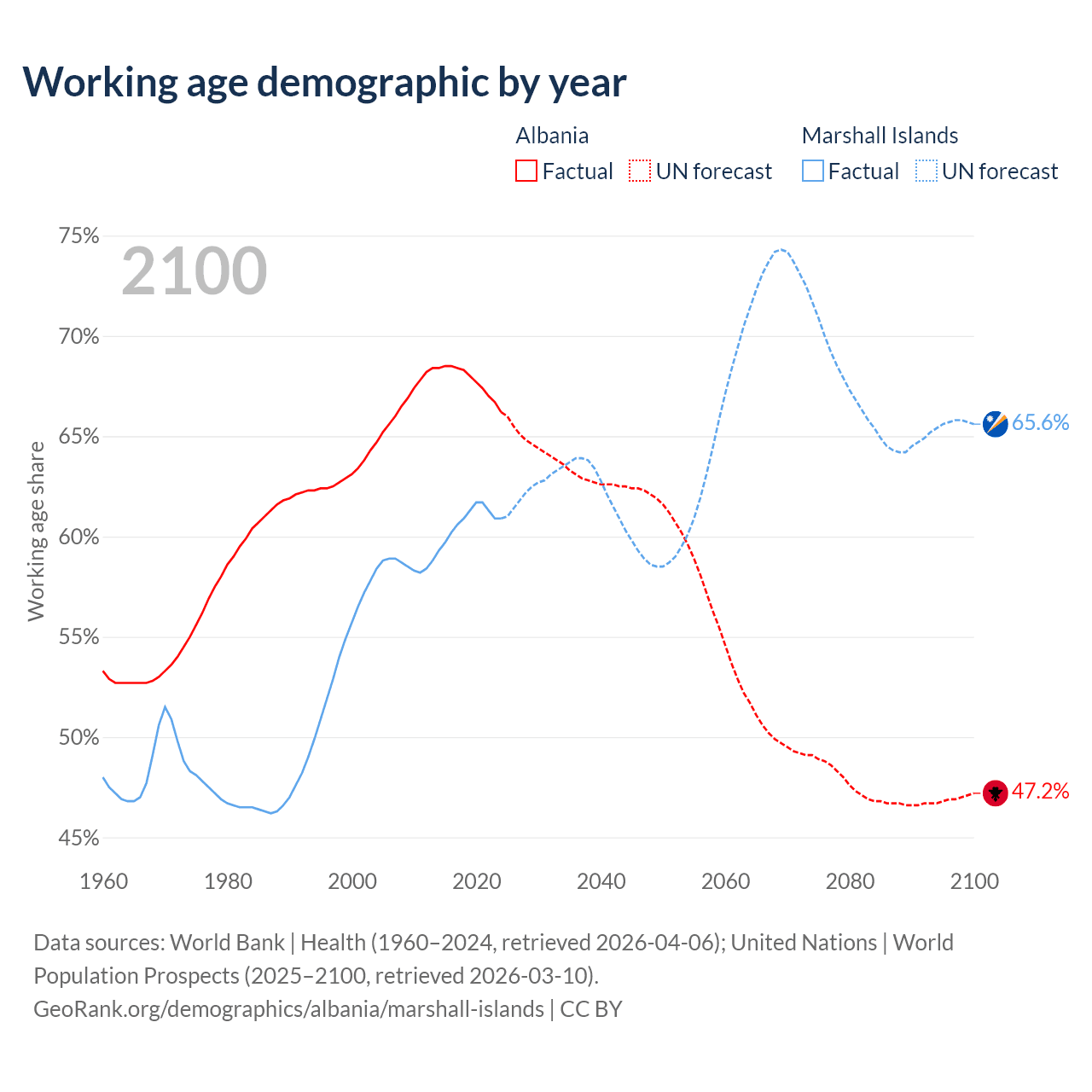 - Albania has 1.55M working age adults (aged 15-64) vs 21.3K in the Marshall Islands.