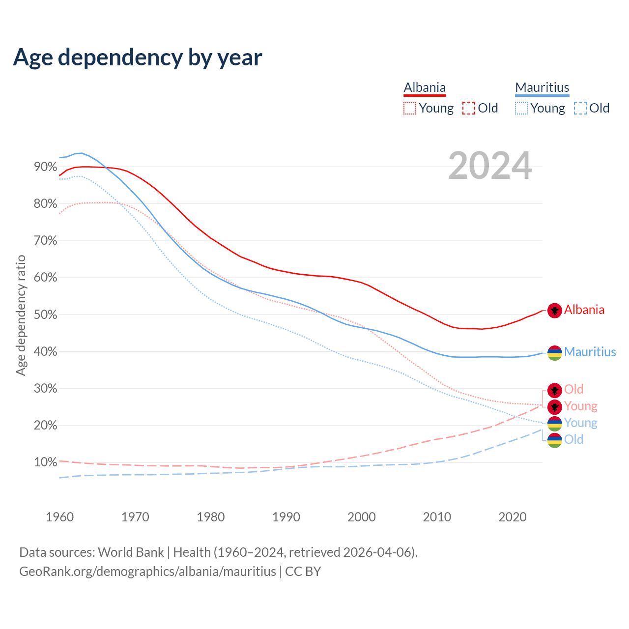 - The share of old-age demographic (65+) in Albania is 16.9% vs 13.5% in Mauritius.