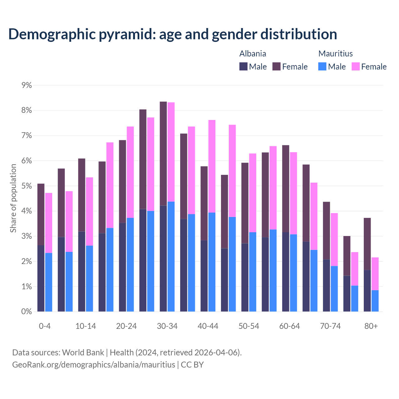The share of older people aged 65 and over is 16.9% in Albania and 13.5% in Mauritius. Life expectancy in Albania compared to Mauritius .