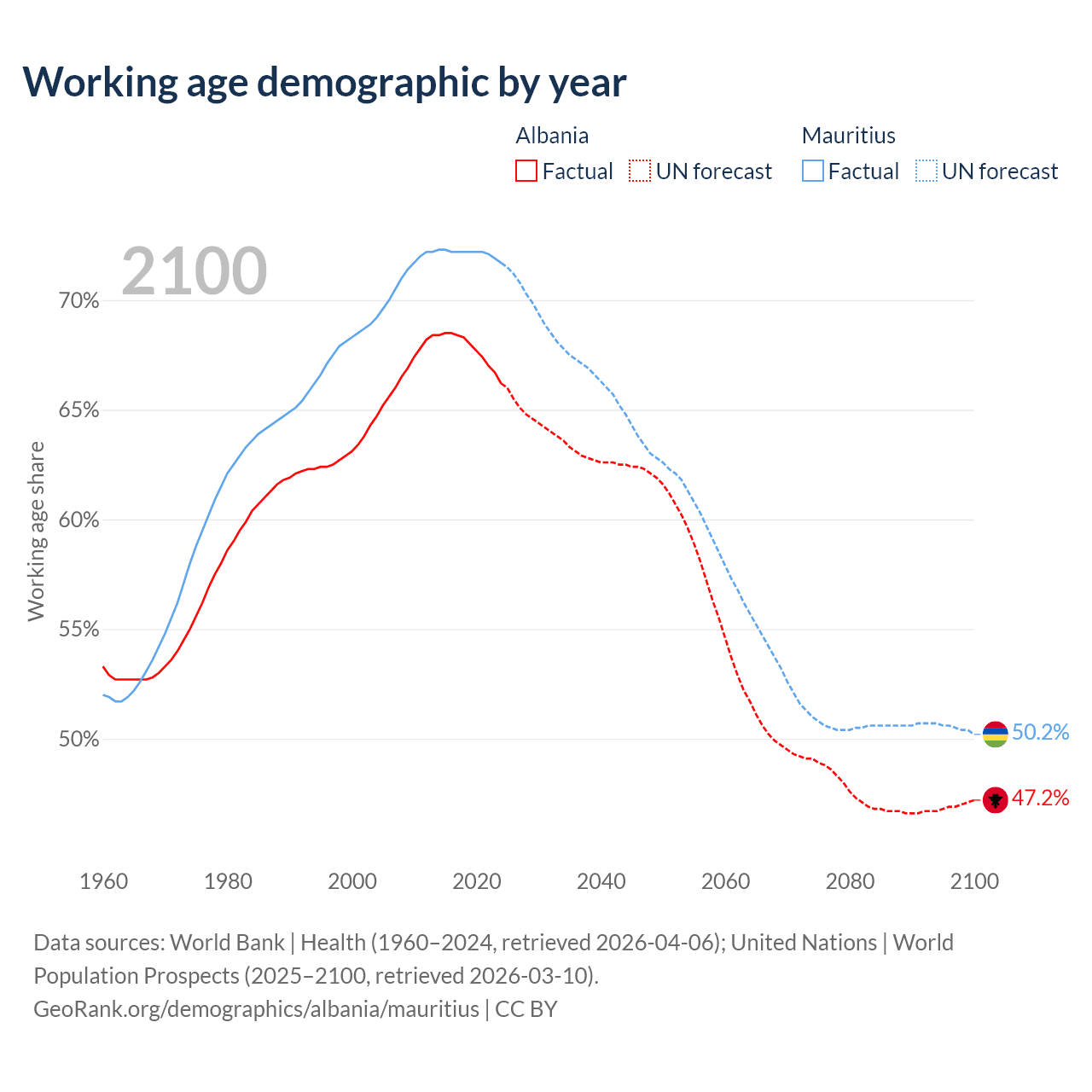 Median age Albania vs Mauritius, 1960-2100