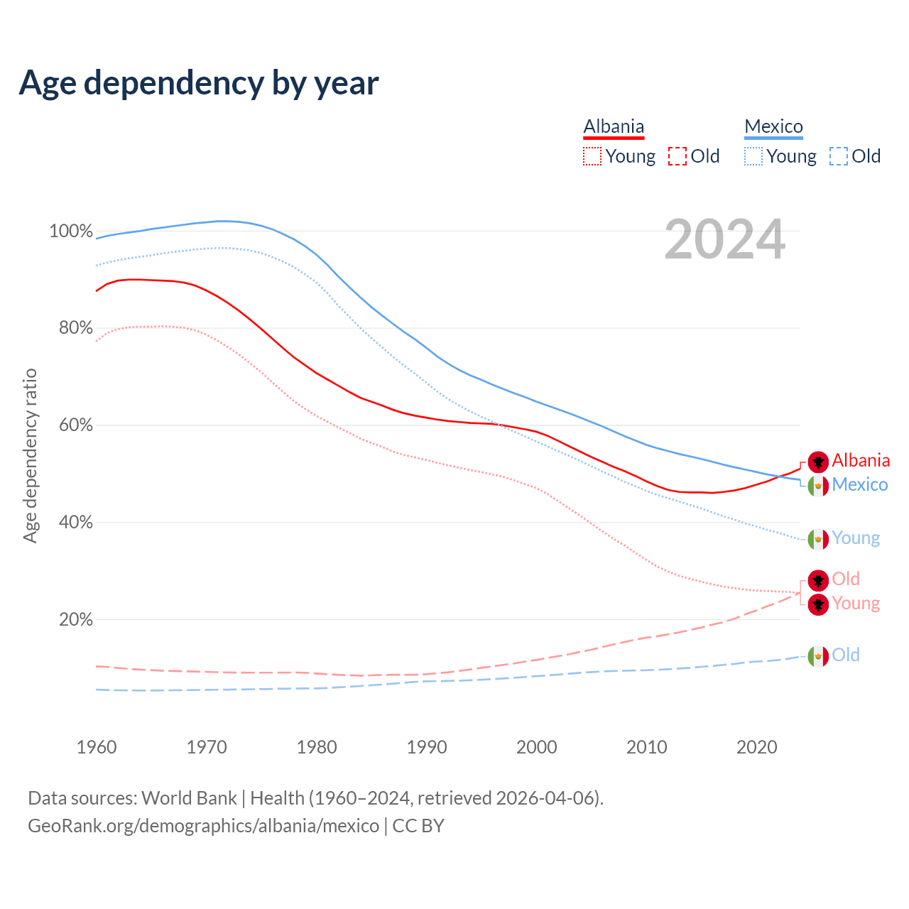 Data sources: World Bank | Health (1960–2024, retrieved 2026-04-06); U.S. Census Bureau (1960–2024, retrieved 2026-02-08).