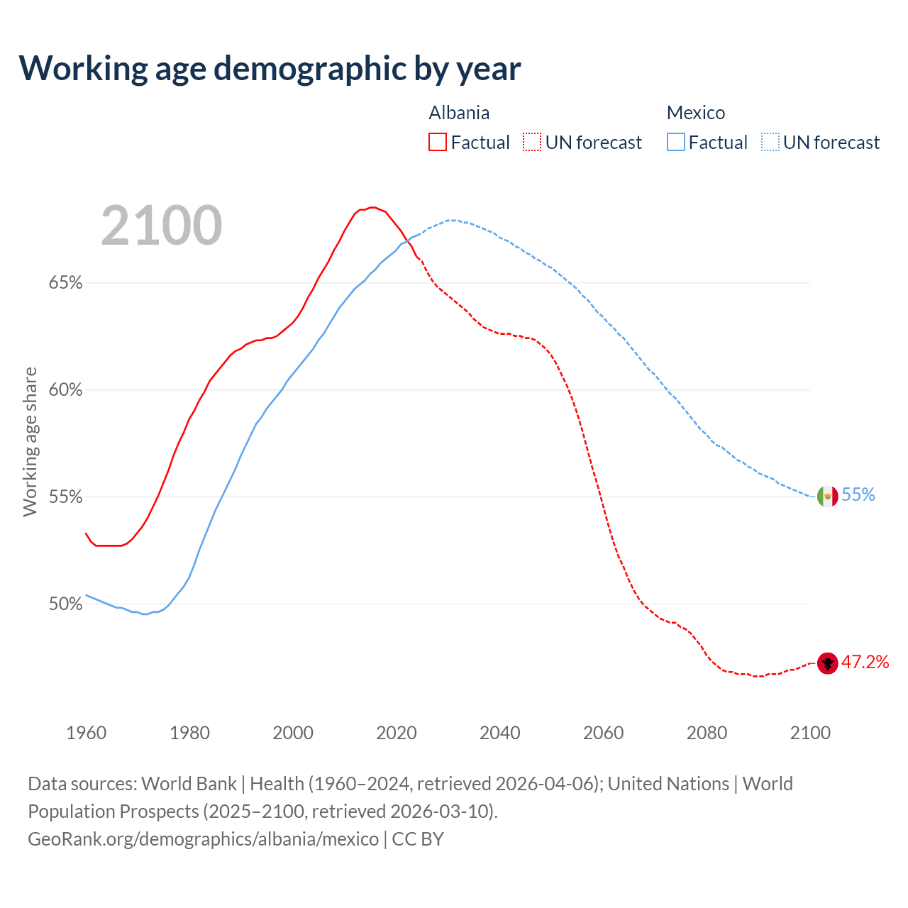 Median age Albania vs Mexico, 1960-2100
