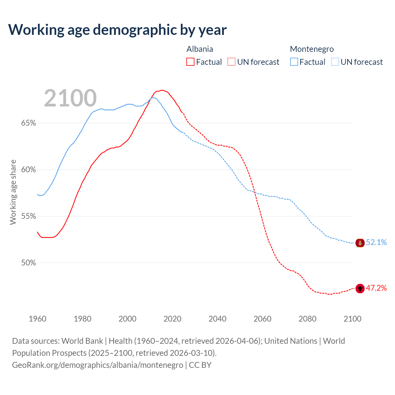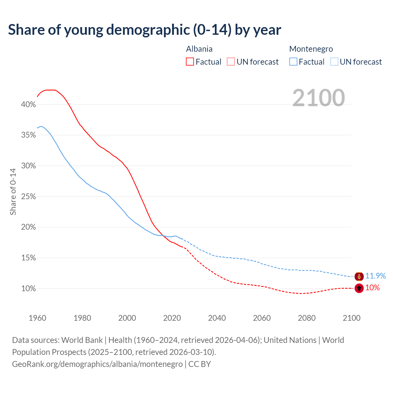 Median age Albania vs Montenegro, 1960-2100