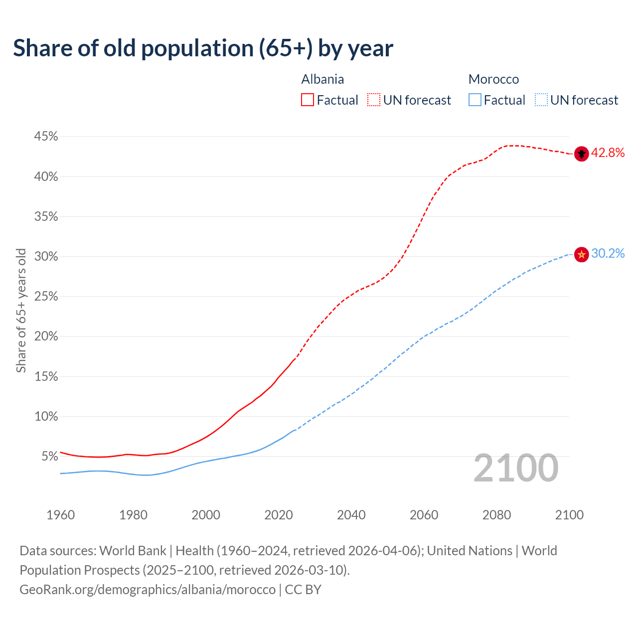 The share of older people aged 65 and over is 16.9% in Albania and 8.14% in Morocco. Life expectancy in Albania compared to Morocco .