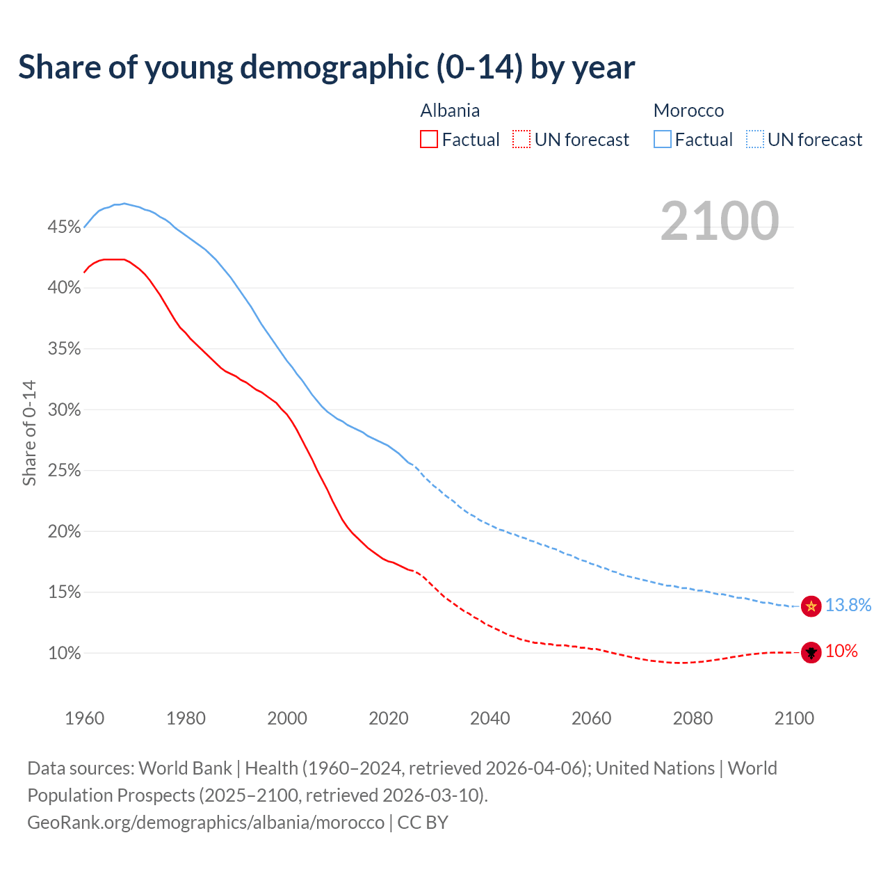 - The share of young demographic (0-15 years old) in Albania is 16.8% vs 25.6% in Morocco.