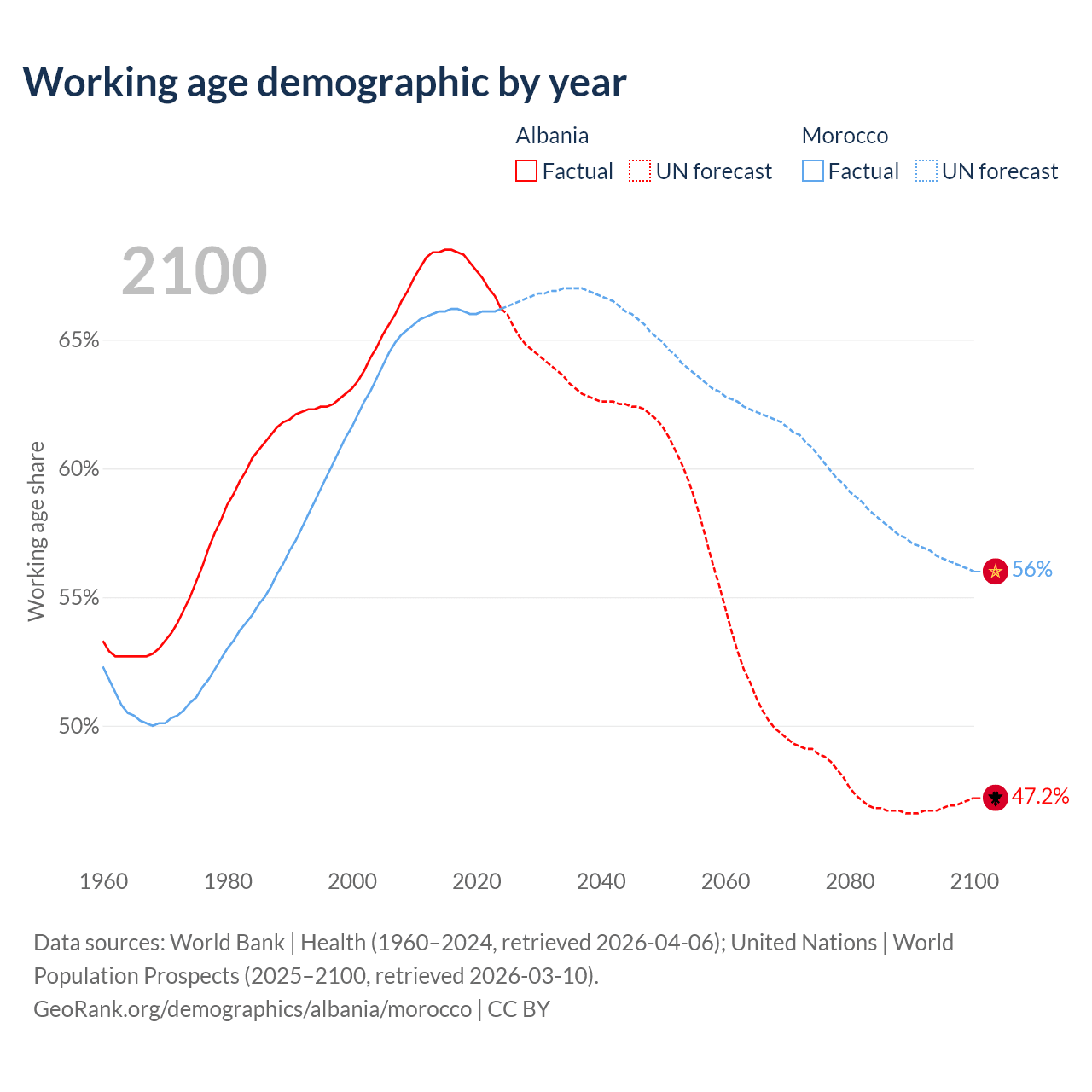 - Albania has 1.55M working age adults (aged 15-64) vs 25.7M in Morocco.