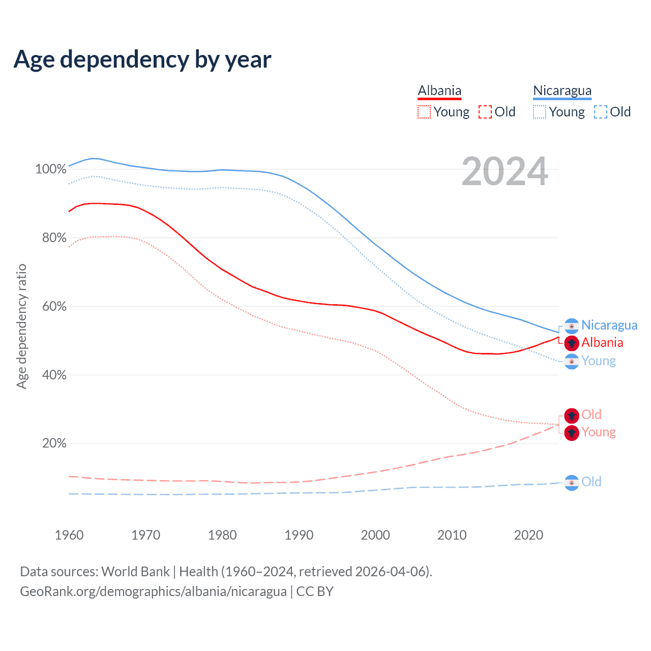 Data sources: World Bank | Health (1960–2024, retrieved 2026-04-06); U.S. Census Bureau (1960–2024, retrieved 2026-02-08).