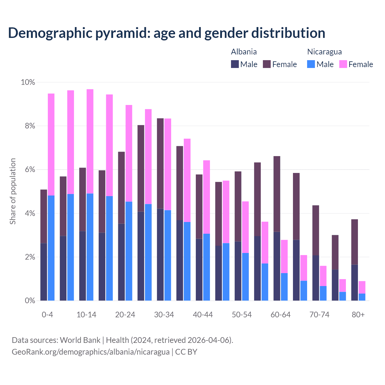 - The share of old-age demographic (65+) in Albania is 16.9% vs 5.53% in Nicaragua.