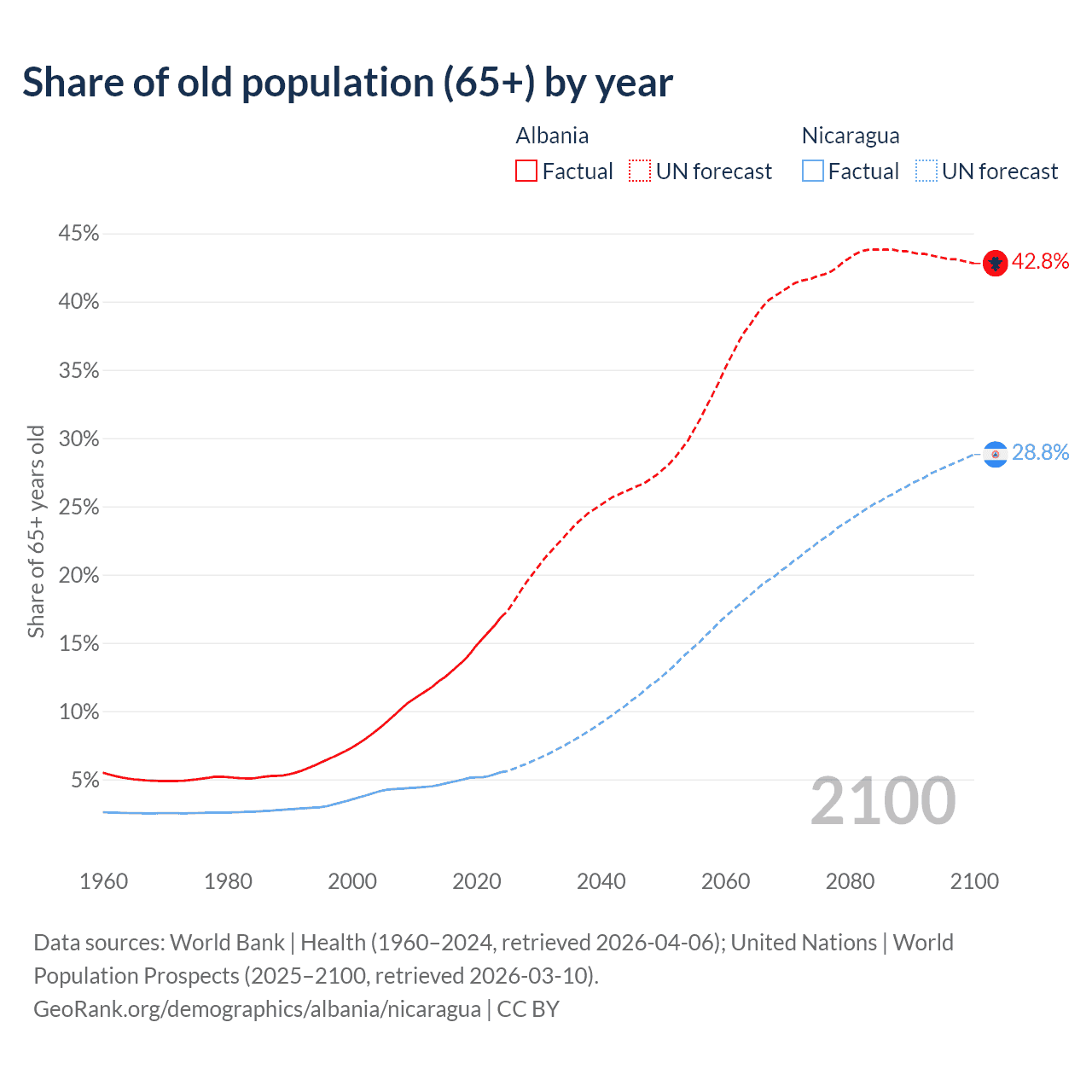 The share of older people aged 65 and over is 16.9% in Albania and 5.53% in Nicaragua. Life expectancy in Albania compared to Nicaragua .