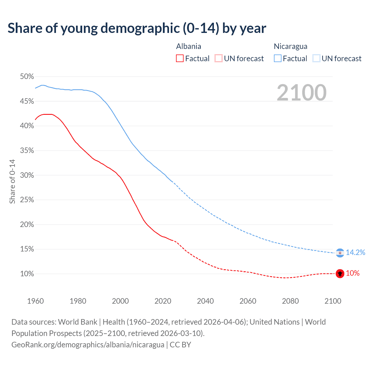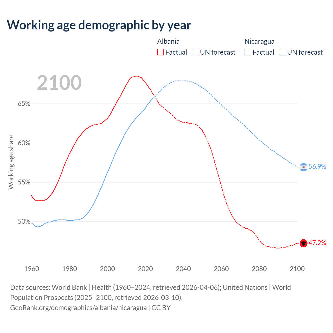 Median age Albania vs Nicaragua, 1960-2100