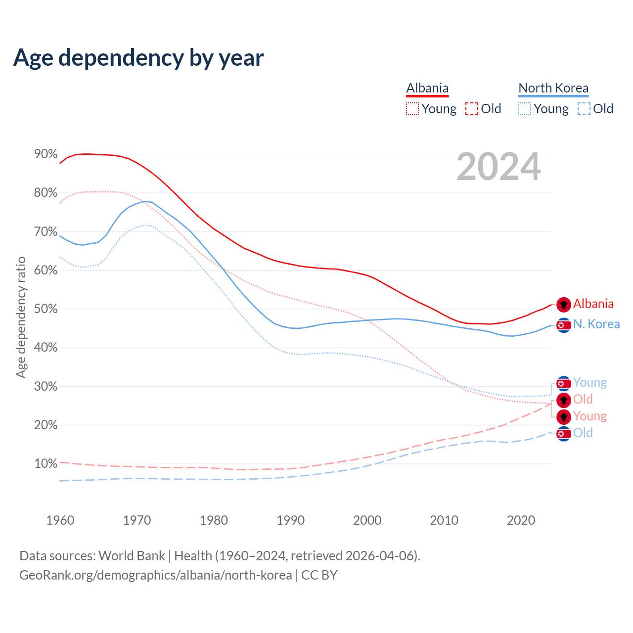 - Albania is ranked 60/196 by median age (oldest to youngest) vs 62/196 for North Korea.