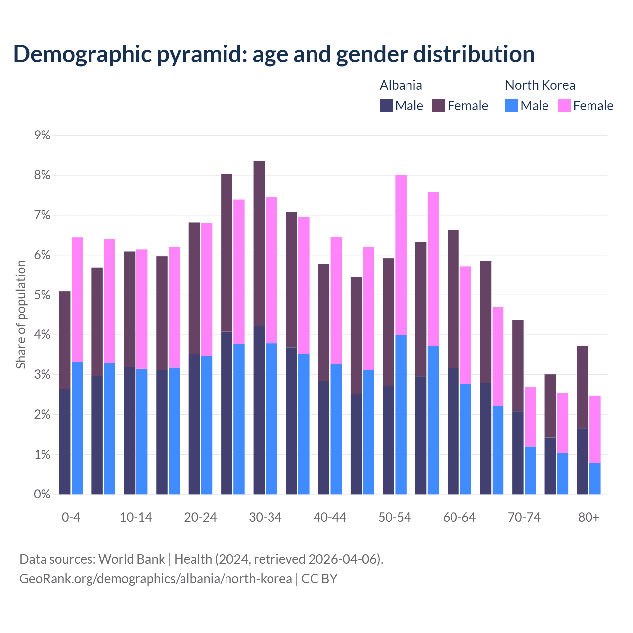 The share of older people aged 65 and over is 16.9% in Albania and 12.4% in North Korea. Life expectancy in Albania compared to North Korea .