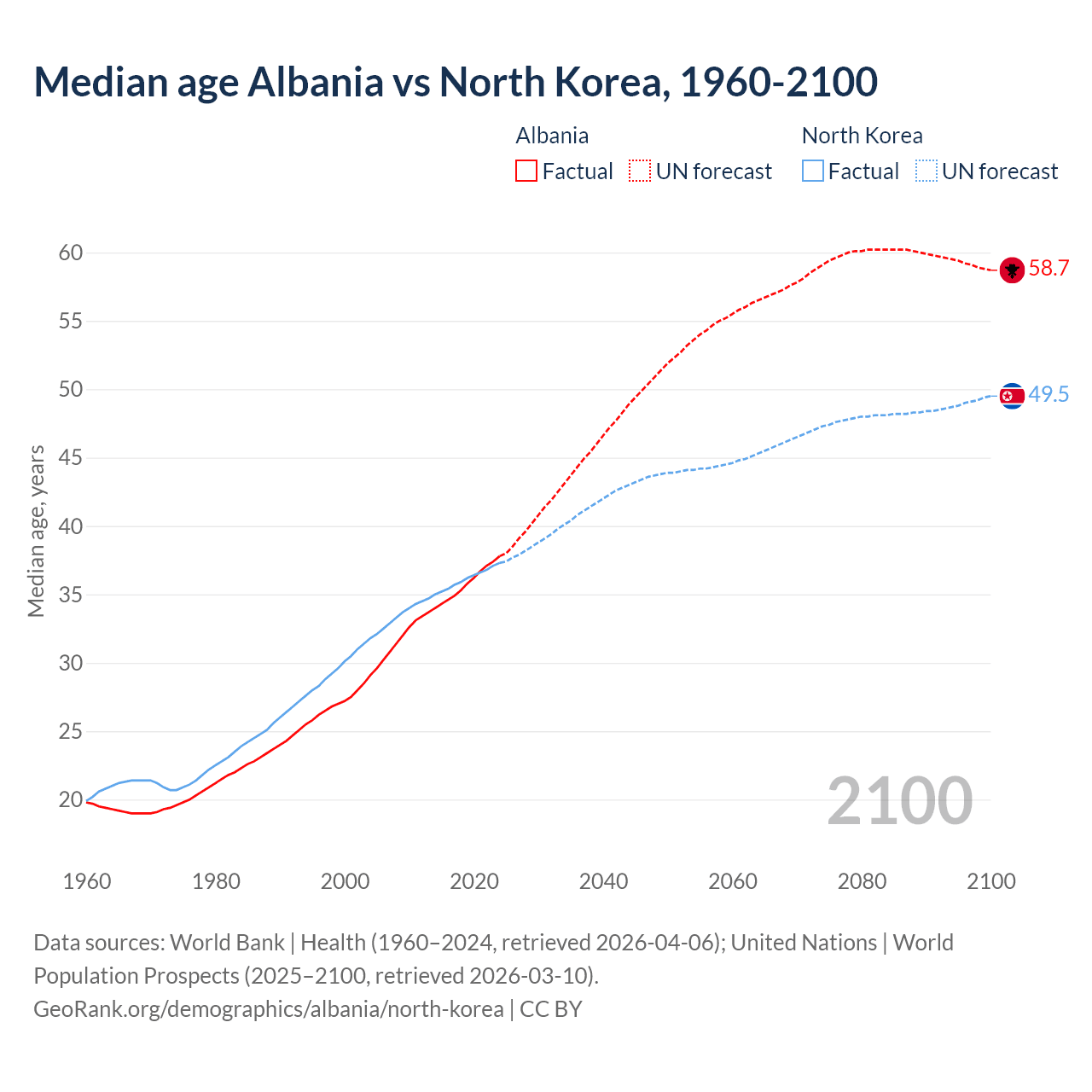 - The median age in Albania is 37.8 years compared to 37.3 years in North Korea.