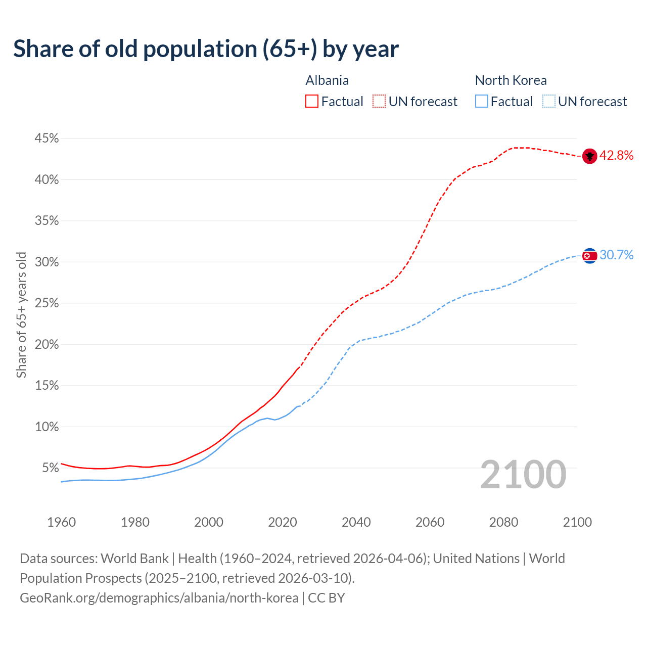 - The share of old-age demographic (65+) in Albania is 16.9% vs 12.4% in North Korea.