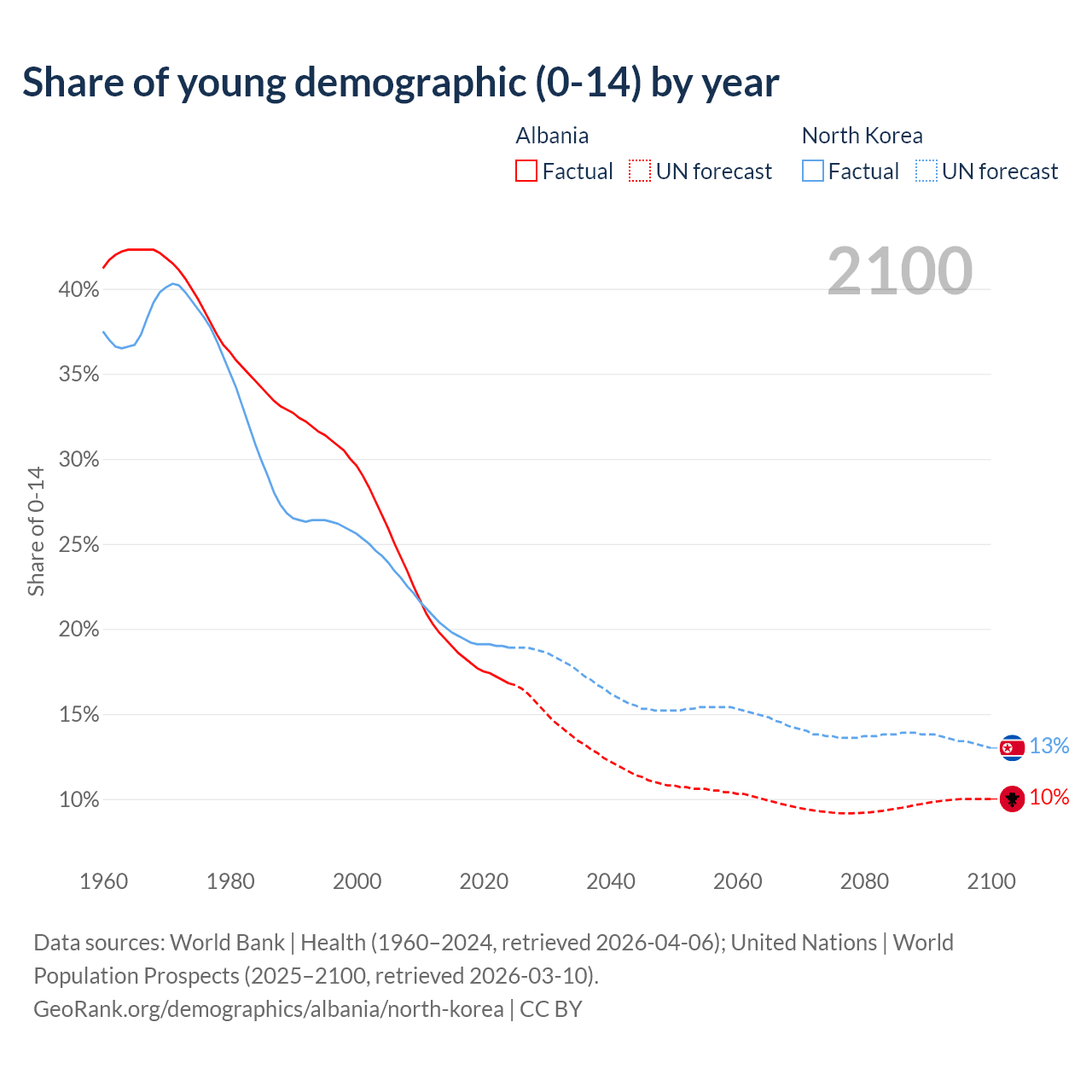 - The share of young demographic (0-15 years old) in Albania is 16.8% vs 18.9% in North Korea.