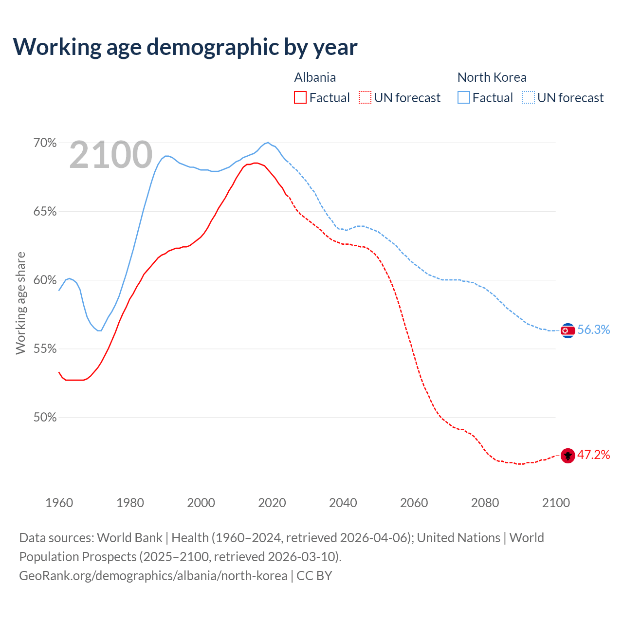 - Albania has 1.55M working age adults (aged 15-64) vs 18.3M in North Korea.