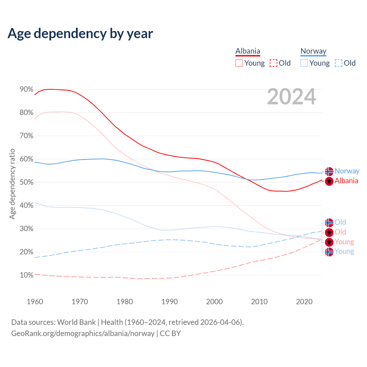 - Albania is ranked 60/196 by median age (oldest to youngest) vs 43/196 for Norway.