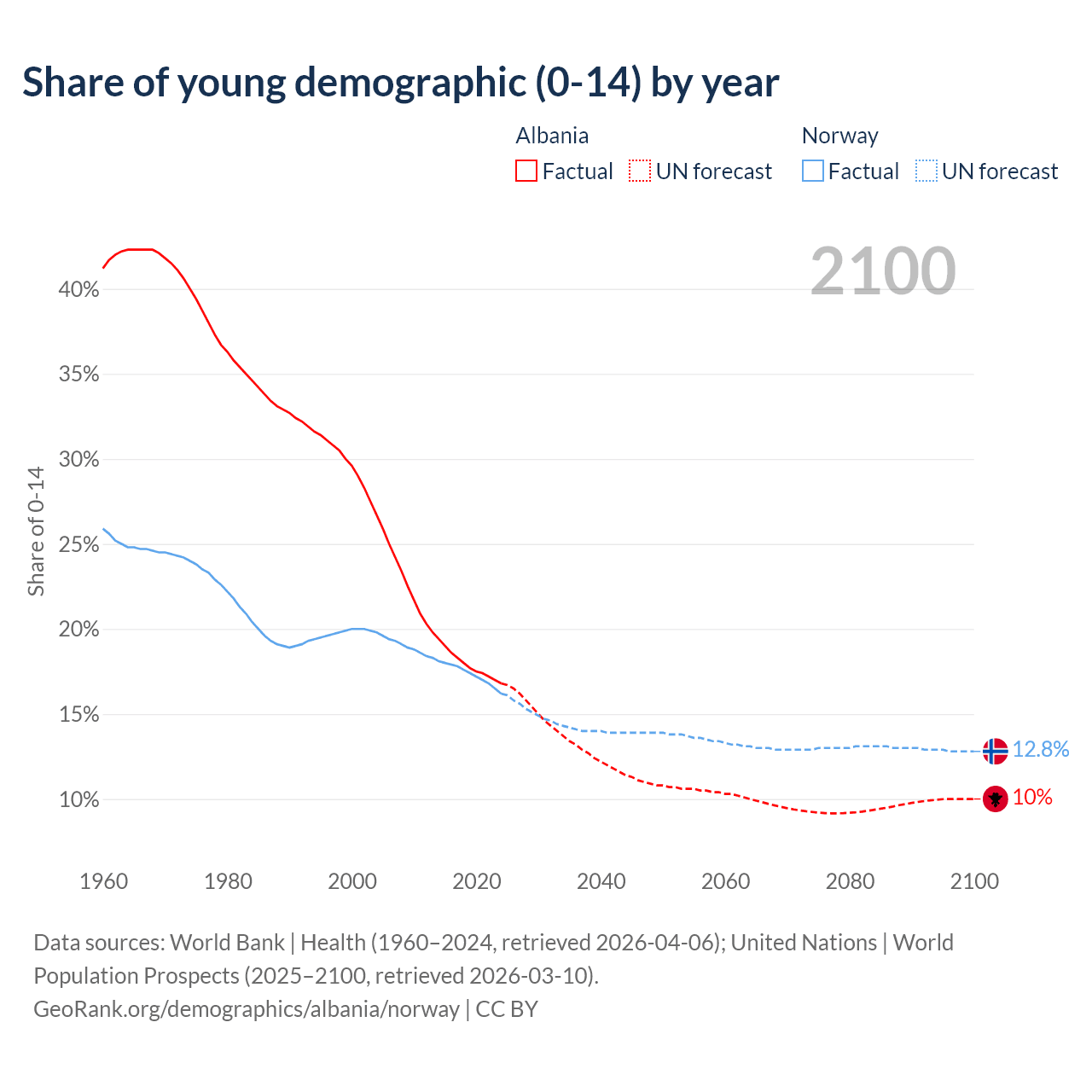 - The share of young demographic (0-15 years old) in Albania is 16.8% vs 16.2% in Norway.