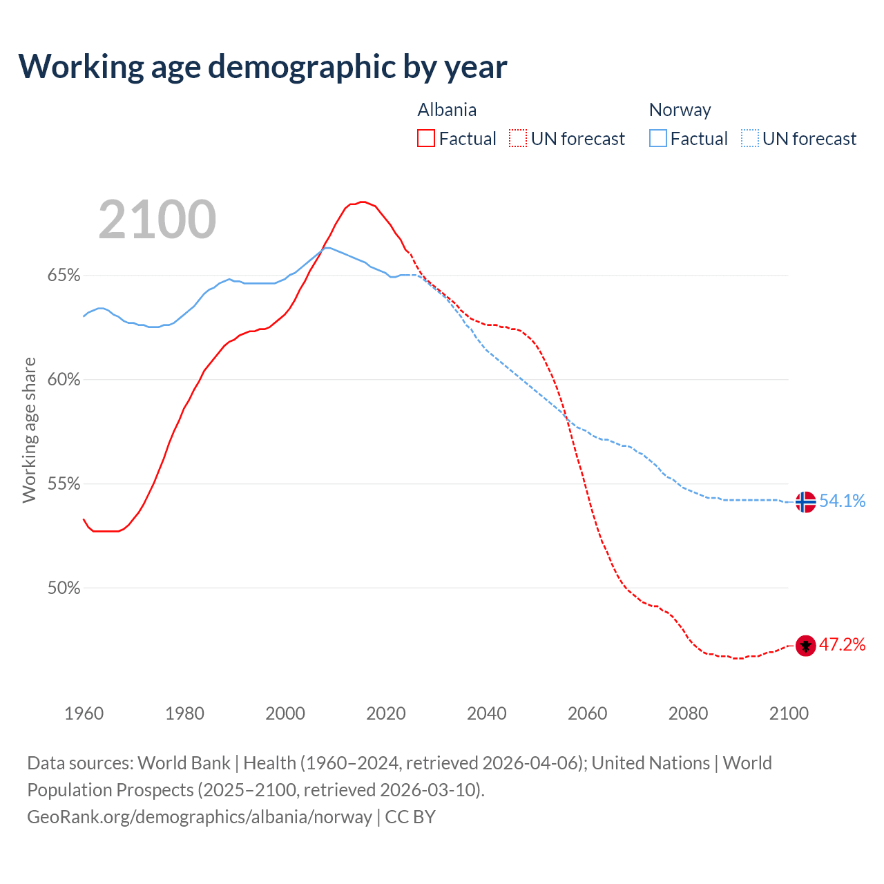 - Albania has 1.55M working age adults (aged 15-64) vs 3.69M in Norway.