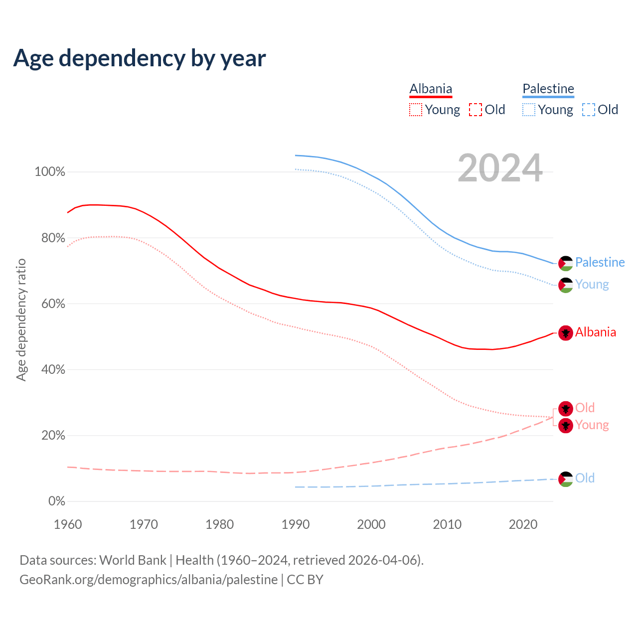 - Albania is ranked 60/196 by median age (oldest to youngest) vs 157/196 for Palestine.