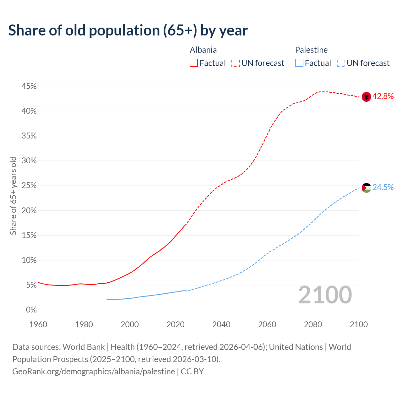 The share of older people aged 65 and over is 16.9% in Albania and 3.84% in Palestine. Life expectancy in Albania compared to Palestine .