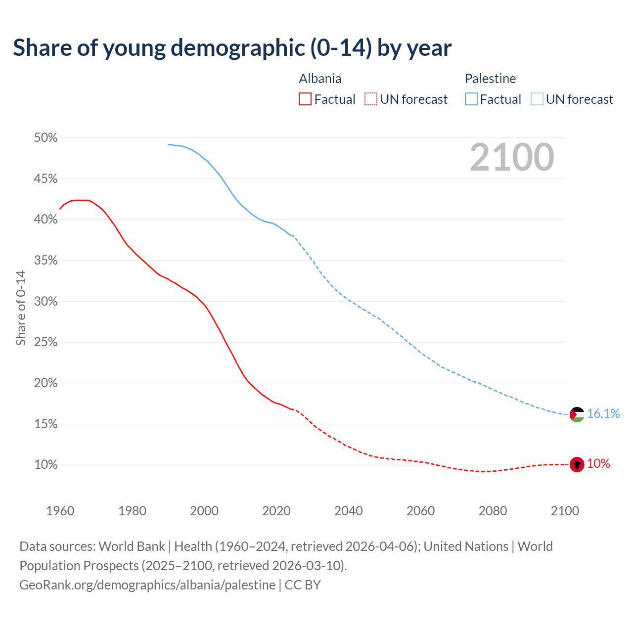- The share of young demographic (0-15 years old) in Albania is 16.8% vs 38% in Palestine.