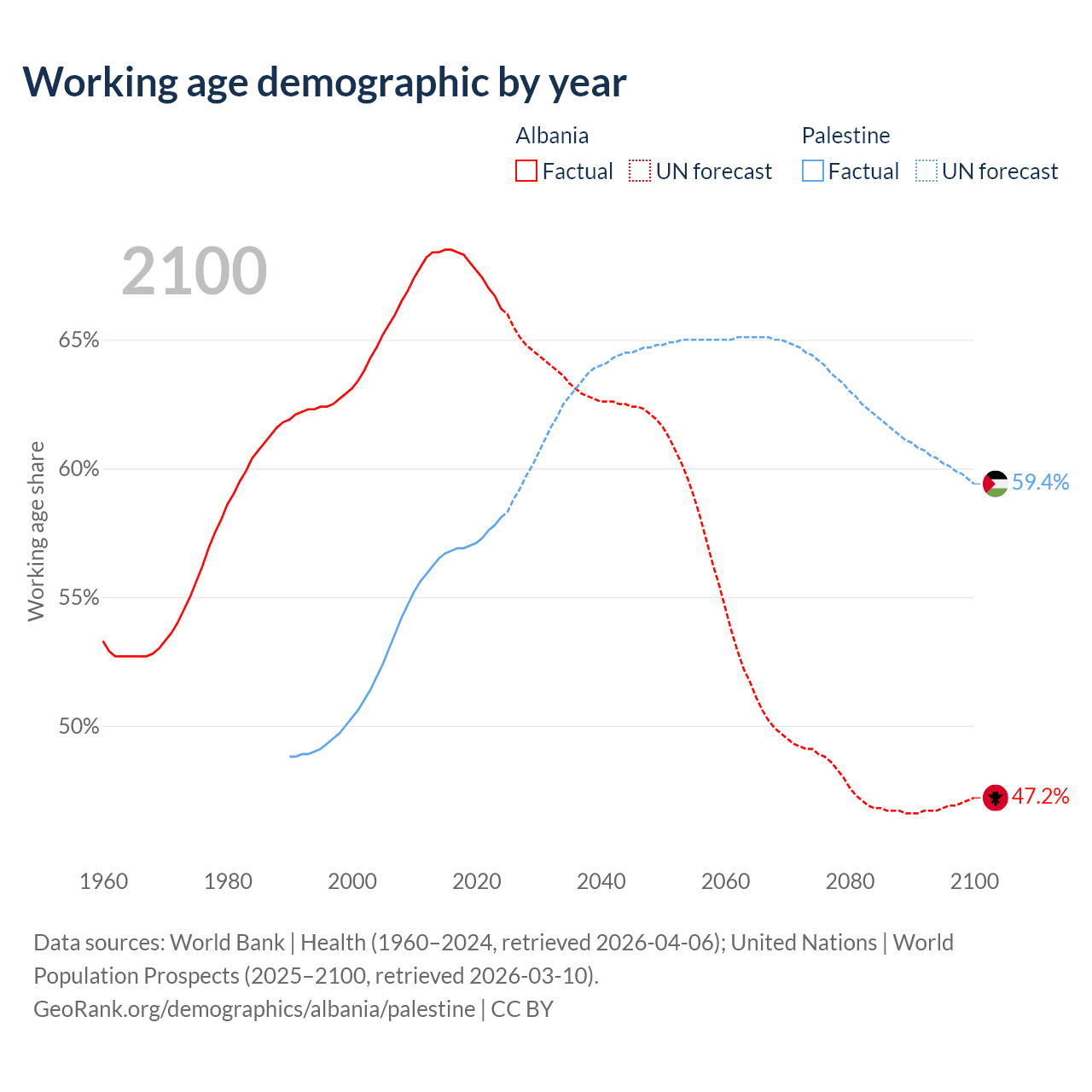 Median age Albania vs Palestine, 1960-2100
